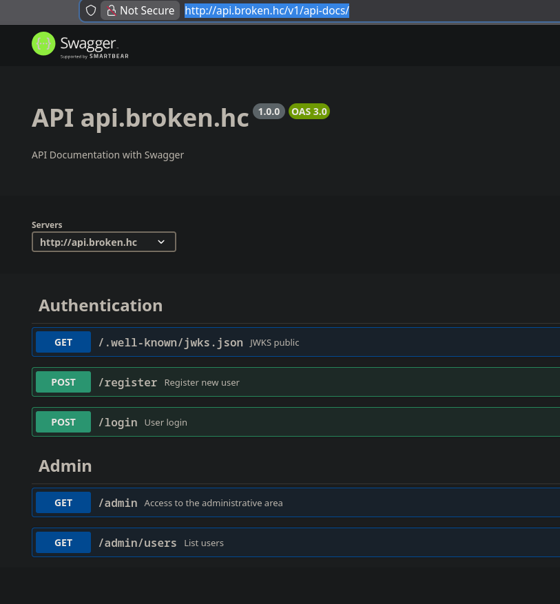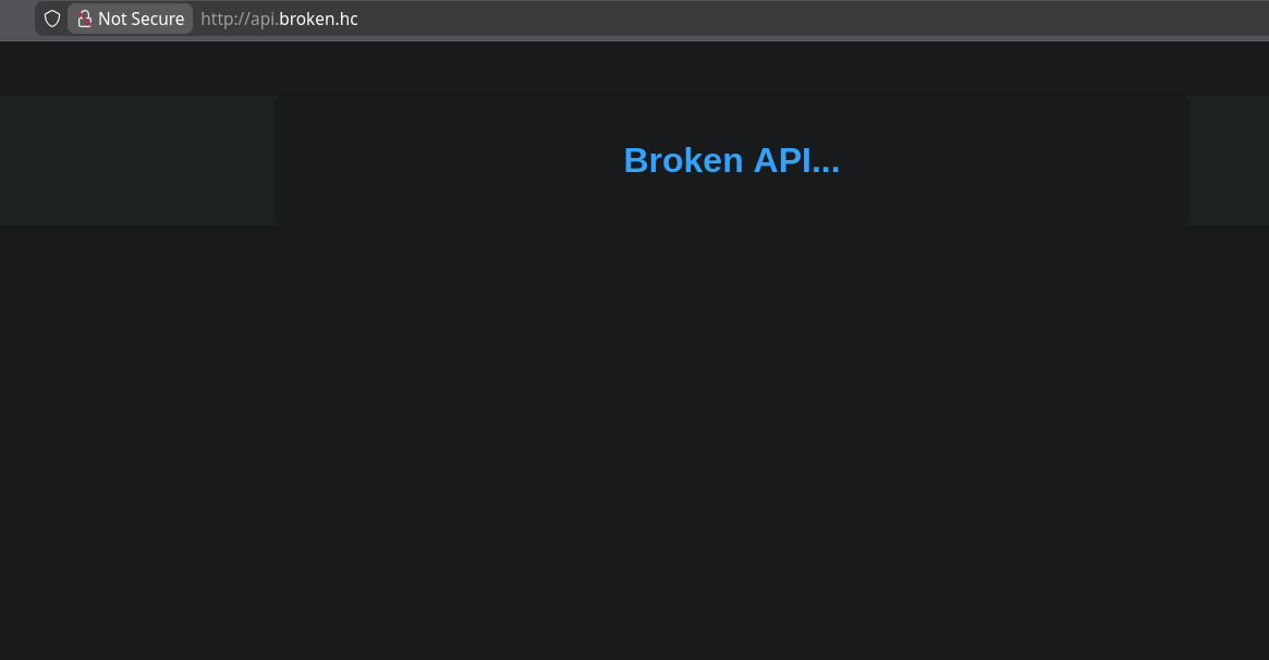 Accessing api.broken.hc reveals a broken API interface: