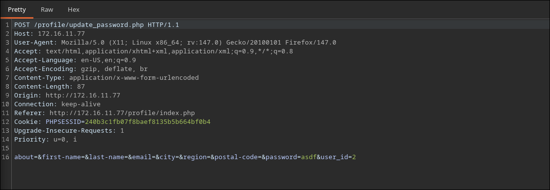 When a user updates their password, the browser sends a POST request to /profile/update_password.php. The body of the request includes the parameters to be updated, but critically, it also includes a hidden parameter: user_id.