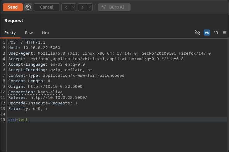Analyzing the request we send the text in the cmd parameter, so we can test for injections on this field