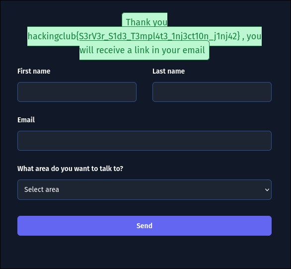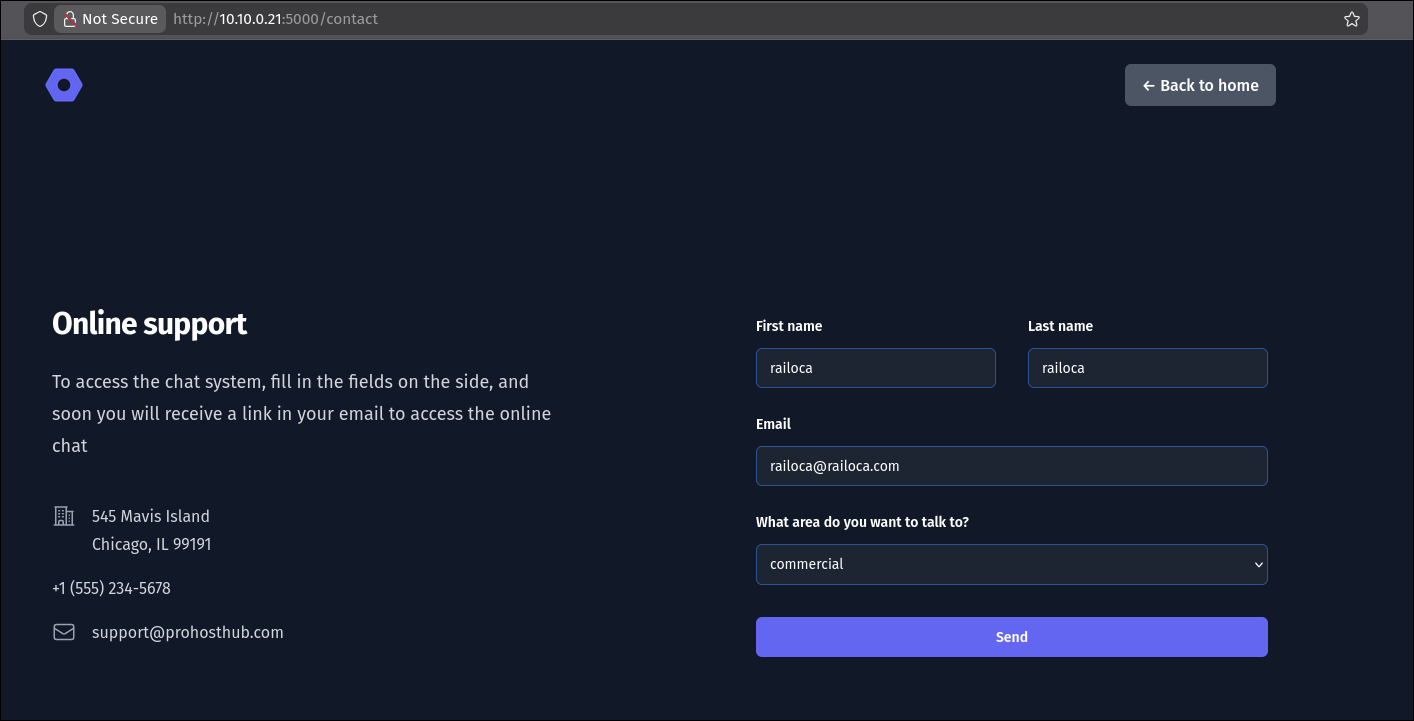 The Hosthub application is a simple website with a “Contact Us” form. When we submit the form, we notice that our input (e.g., the name) is reflected back to us on the confirmation page: