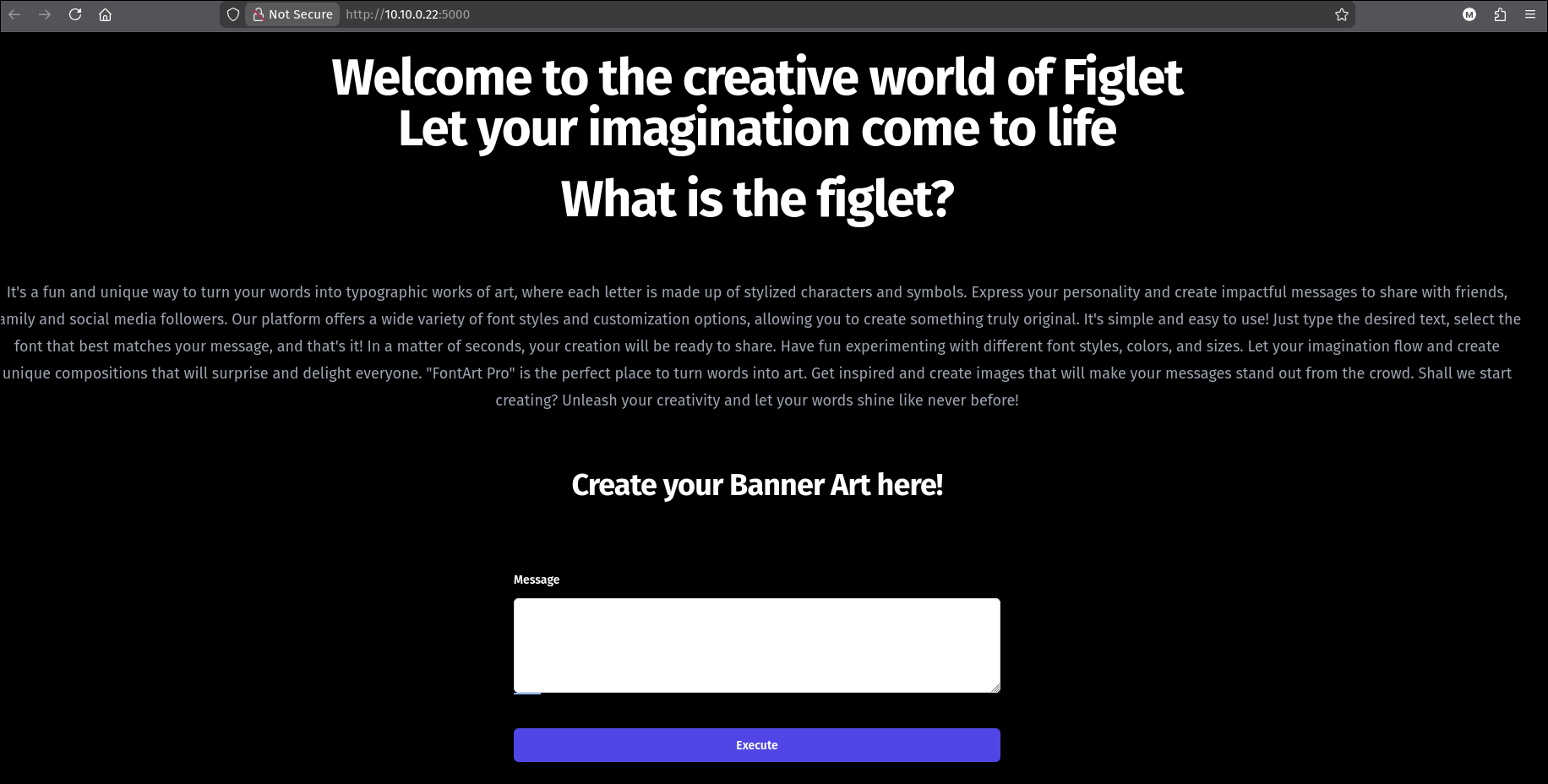 The “AsciiArt” application allows users to generate ASCII banners from text input. By analyzing the behavior, we suspect the backend might be using a command-line tool (like figlet or toilet) to generate this art.