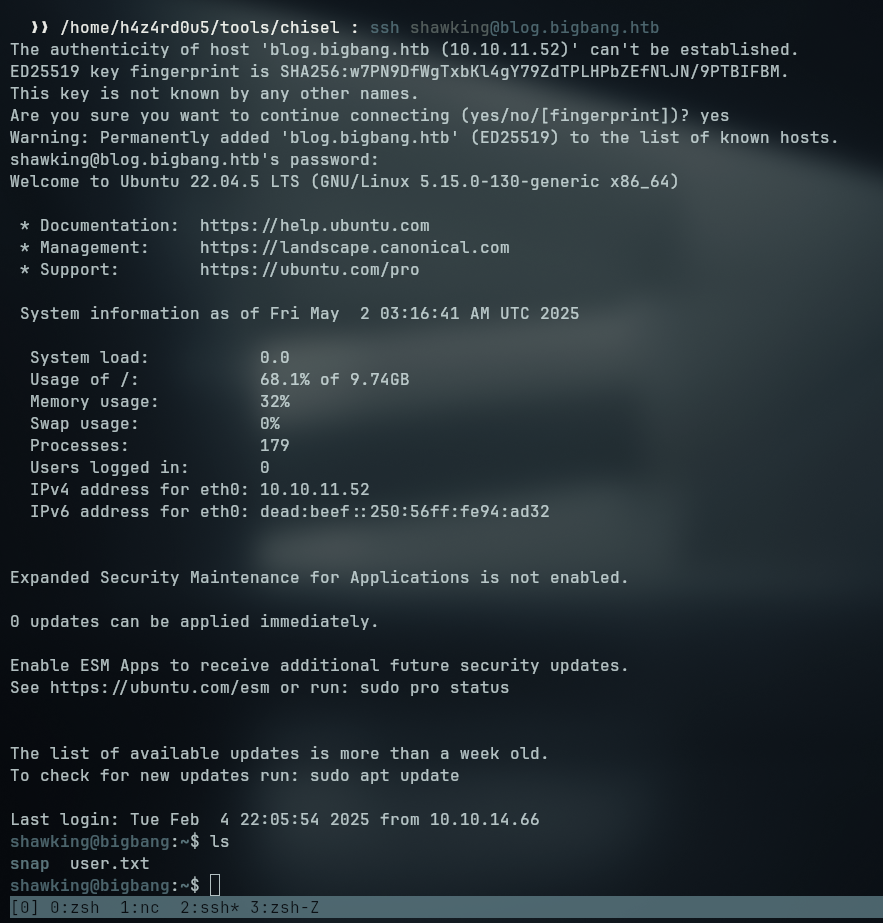 With the obtained credentials we can now access the machine via ssh as shawking