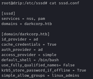 Once on the Linux host as taylor.b.adm, we effectively have root or can escalate via standard domain-level privileges for that user. We can see that the system is configured for domain-based SSSD (System Security Services Daemon). Checking /etc/sssd/sssd.conf shows: