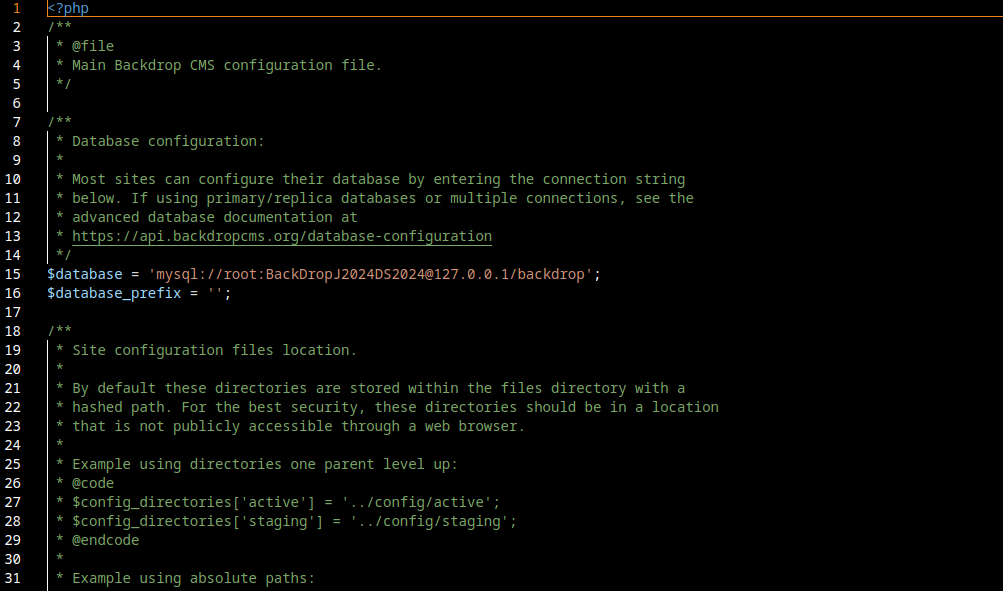 Looking at the settings.php file, we can see that the web server is using a MySQL database alongside with the root credentials of the database.