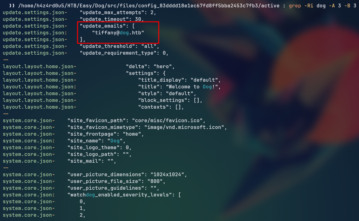 We start by searching for references to the dog word, which is the name of the target machine, which gave us a possible username.