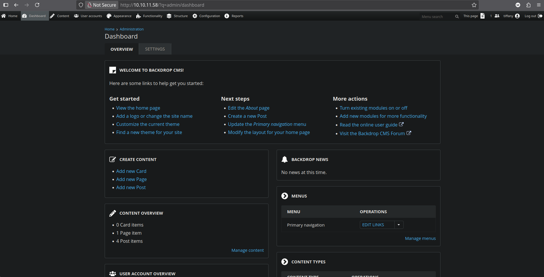 Trying to login with that username and the password we found in the settings.php file, we can successfully login into the web server.