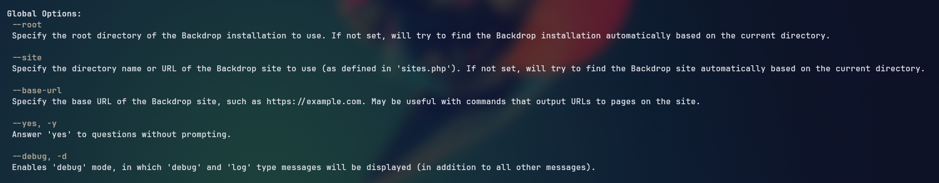Looking at the help, we see it is trying to use the --root flag at our current working directory, which is not a valid Backdrop CMS root directory. So we can use the --root flag to specify the root directory of the Backdrop CMS, which is /var/www/html, or run the command from that directory, granting us root command execution.