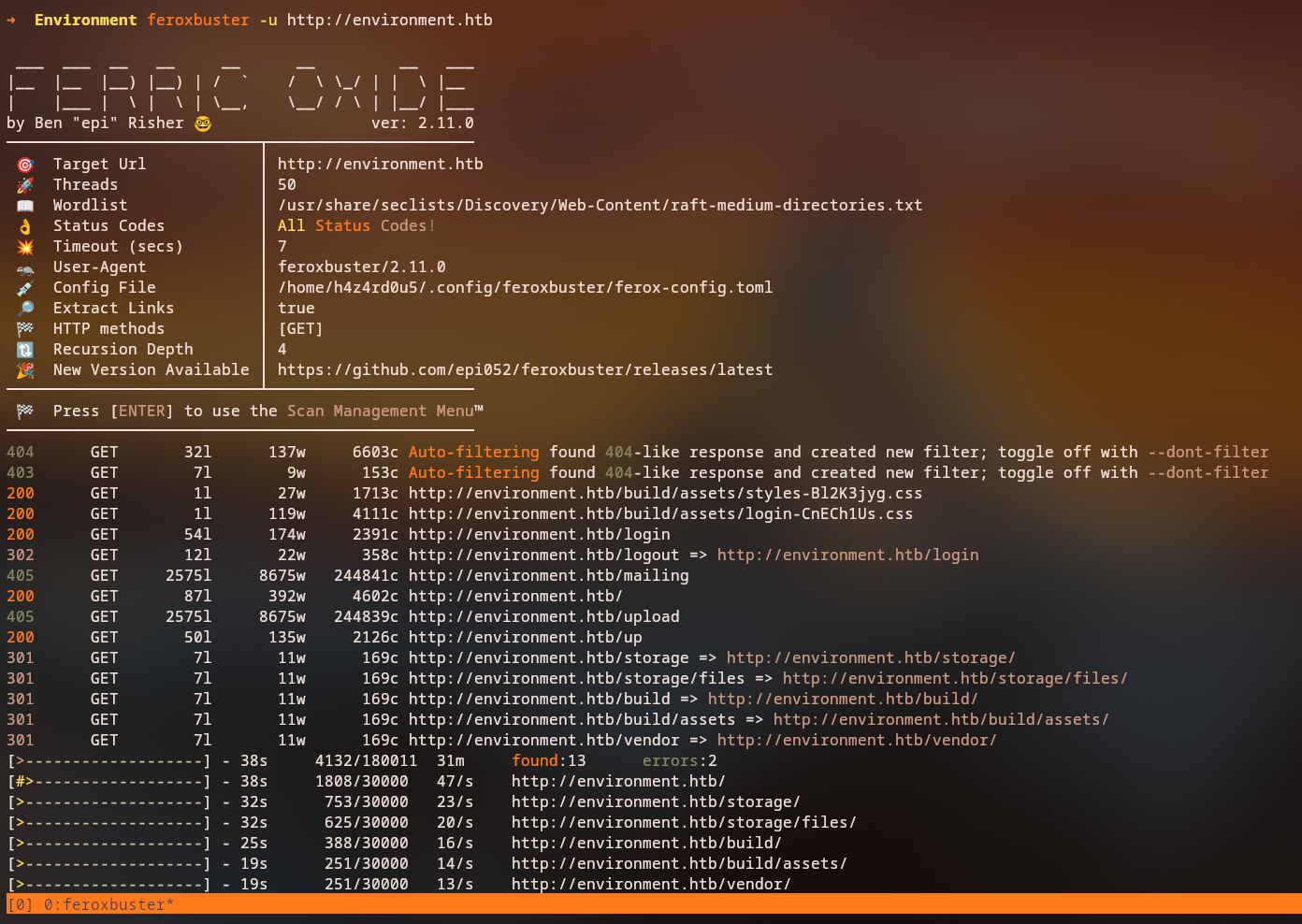 When we attempt to access the web service, we’re redirected to environment.htb. We need to add this to our /etc/hosts file: