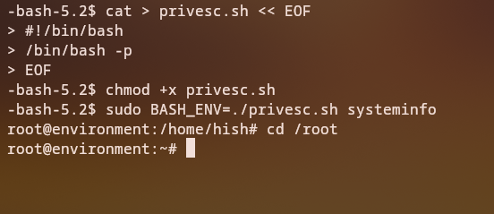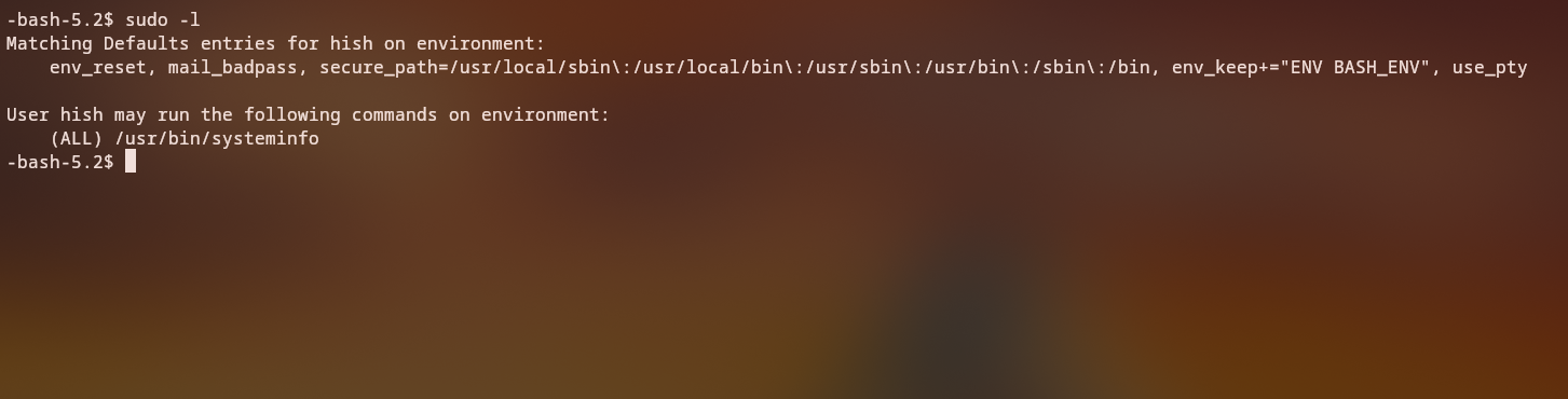 We discover that hish can run /usr/bin/systeminfo with the env_keep+=ENV BASH_ENV option in the sudoers file.