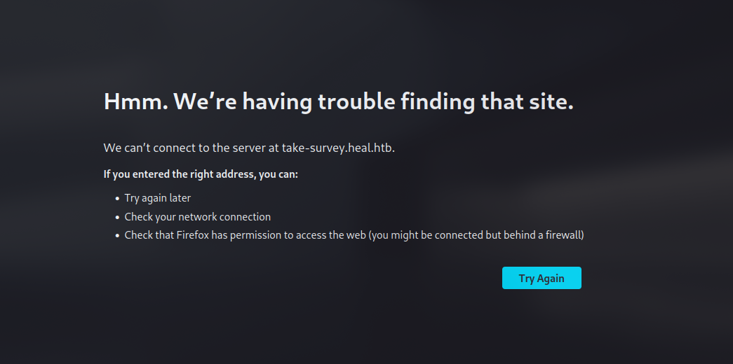 Heal is a medium difficulty machine which was only running a web server and a SSH service. The web server was running a ruby on rails application which was vulnerable to an LFI (Local File Inclusion) and allowed us to read the database file. The database file contained a password hash which we were able to crack and use to login into the application as an administrator. The administrator account had access to a limesurvey application which was running on another subdomain. We were able to use the same credentials to login into this application and get access to the limesurvey application, which was vulnerable to CVE-2021-12-09, abusing the exploit we got a foothold on the machine as www-data. Reading the configuration files for the limesurvey application, we found the credentials for the database and the SSH user ron had reused those credentials. Using the credentials for the SSH user, we were able to login into the machine as ron and escalate our privileges to root by abusing the consul service which was running locally on port 8500 of the machine.