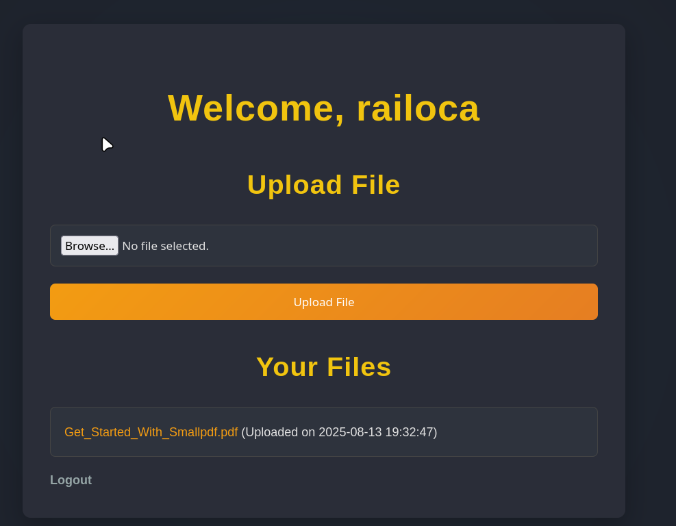 We can see that there is a login page and a registration page. After registering a new user, we can log in with the credentials we just created and access the dashboard, giving us an option to upload files.