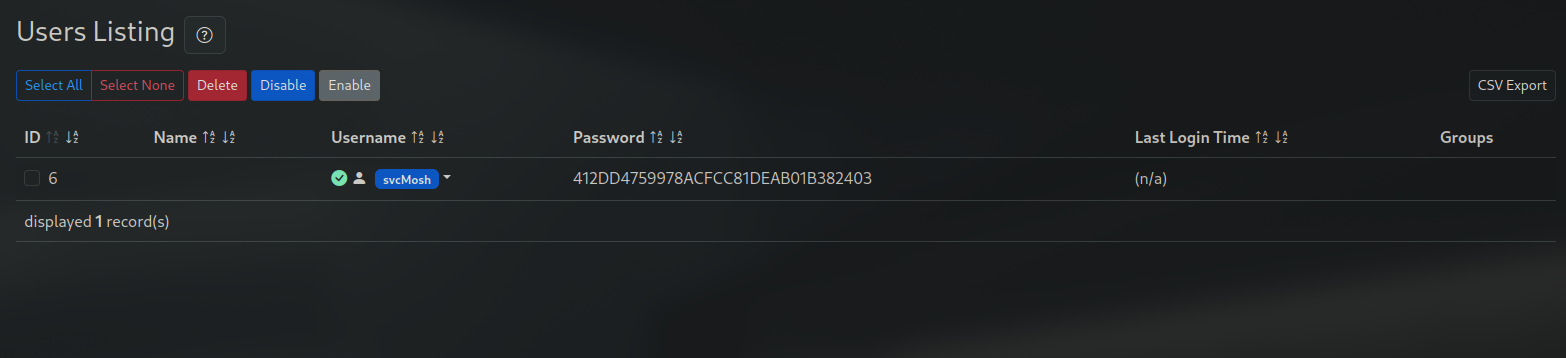 Looking around on the page, we can list all users and conveniently, it brings their hashed password as well